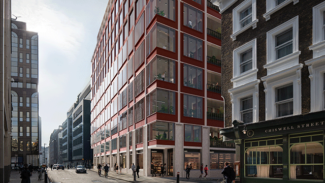 The City recently approved the sustainability-focused retrofit of an office block near the Barbican. 1 Moor Lane will contain 300,000 sq.ft. of office space, 50% more than the existing structure, along with landscaped terraces and wellness facilities for workers.